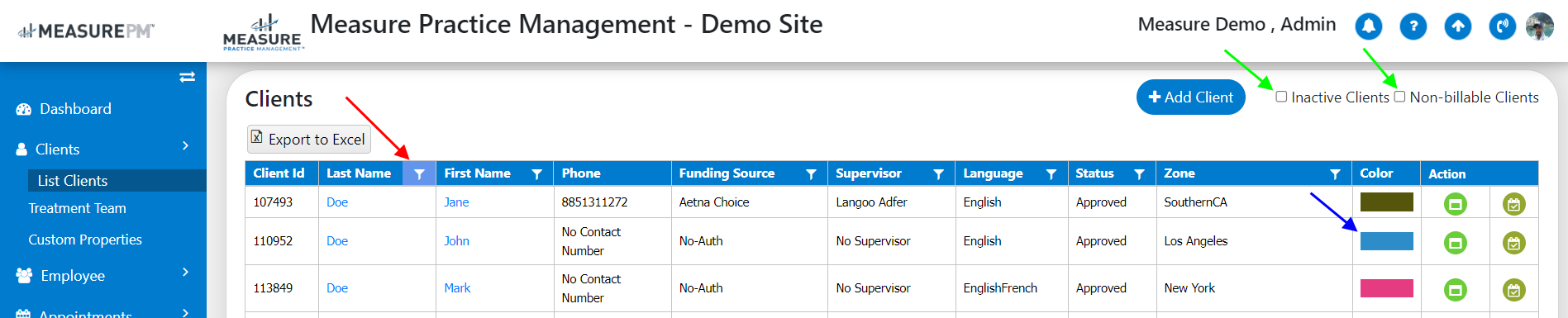 By default, the page shows all active clients. The order of the List clients is as per the last authorization added so a user will see the last added authorization at the top of the list. Green arrows in the above screenshot indicate checkboxes for inactive and non-billable clients. The inactive client checkbox at the top-right of the page will show only inactive clients and the Non-billable client checkbox will show only Non-billable clients.