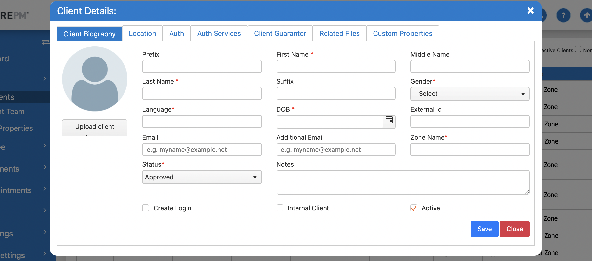 Client biography holds the basic information of the client. Fill in the necessary information of the client and click on 'Save'.