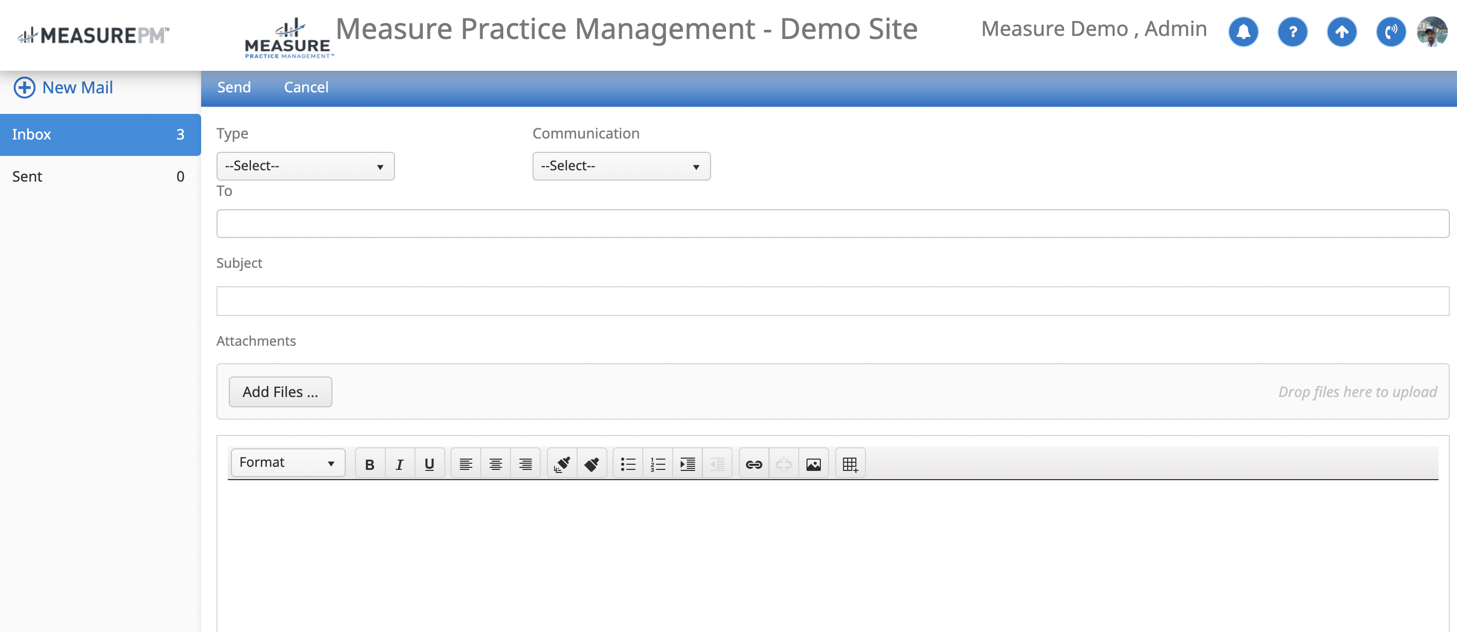 Click on 'New Mail' at the top left of the screen. Fill in the necessary information. A user can attach files. Click 'Send'.