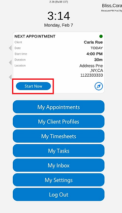 Please note, data collection can only occur within an active appointment. Therefore, when you log onto the Mobile-App, you must resume or start an appointment to access the data recording screens. To do so, select Resume or Start Now from the appointment preview window on the Employee Dashboard.