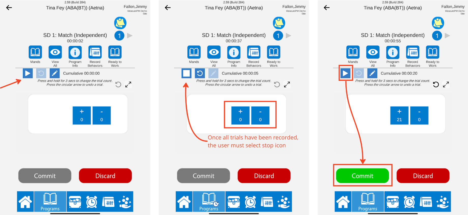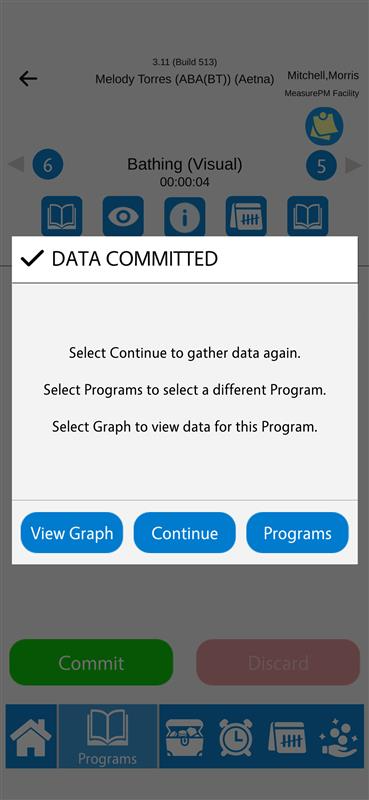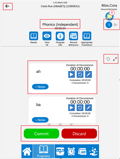 To record a response, tap on the appropriate response option once for each response. Alternatively, to record multiple trials at one time, hold the appropriate data recording type for 3 seconds, then enter numeric text or use the up/down toggle arrows to edit the trial count. Please note, response options are configured by individual facilities and may be customized for individual programs and/or clients. To remove a trial, select the undo button in the top right hand corner of the recording window. Trials will be removed in reverse order in which they were recorded. As you collect data, users may need to scroll to reveal more data input boxes or to reveal more targets. The user can also expand the data recording window by using the opposite direction arrow icon to the right of the first target. Once the user has completed collecting data for a given program, and met the minimum trial requirement, the Commit button will turn green. Select Commit to submit the data or Discard to clear all data.