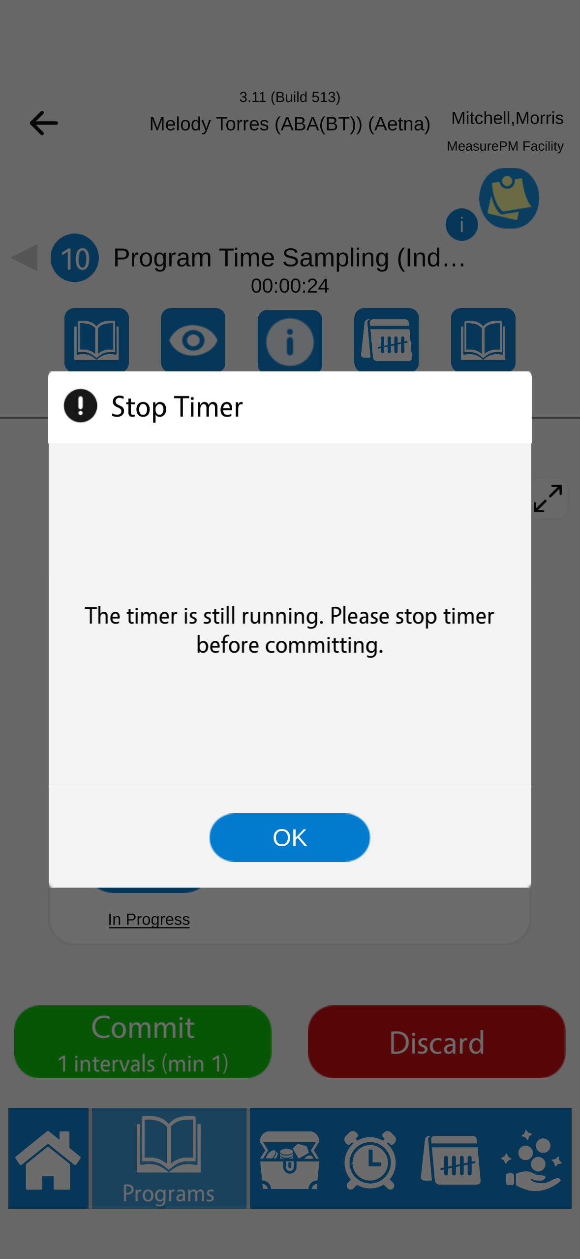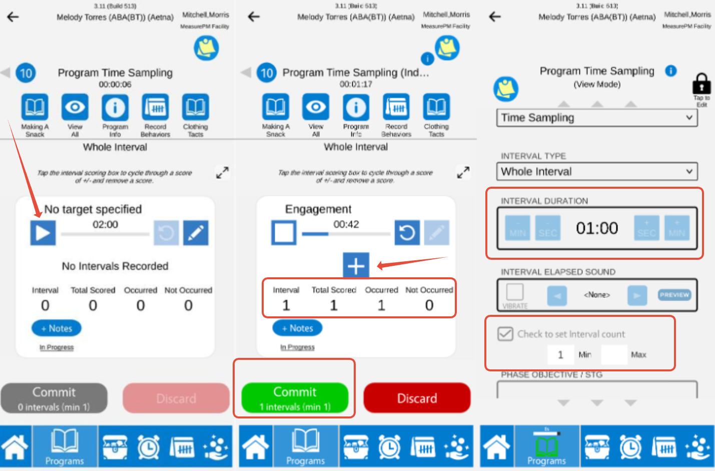 To record Time Sampling data, select the play button to initiate the interval timer. At the end of each interval a square will become available for scoring. Tapping the square once will place a +. Tapping it a second time will turn it to a -. Tapping it a third time will remove the score. Providers are NOT required to score the intervals. Unscored intervals will be discarded when the data is committed. Note, if a maximum number of intervals is configured, blank/unscored intervals are counted as part of the maximum value and the interval timer will stop running. For example, if the maximum is set to 10, the timer will stop running once 10 intervals (6 scored and 4 unscored) have elapsed.