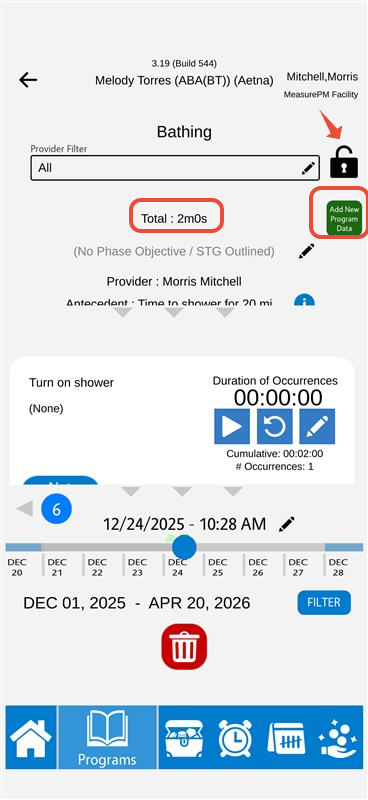 The raw data can also be viewed on the Mobile-App via Program Data and will appear as it does below. The same data will be displayed on the Web and Mobile-App, however on the Mobile-App you are also able to edit the data if you have permission to do so. To edit historical data, select the unlock icon to edit, and then proceed with making changes. To add a new set of data select Add New Program Data and proceed with adding new data from there. If you are only wanting to view the data and not edit, you can see the Total Duration at the top of the page along with Duration and Occurrence Count per target in the window below.