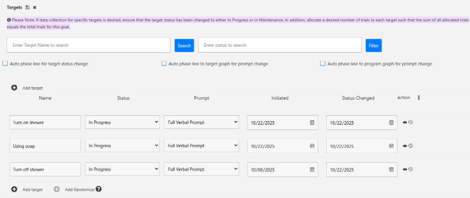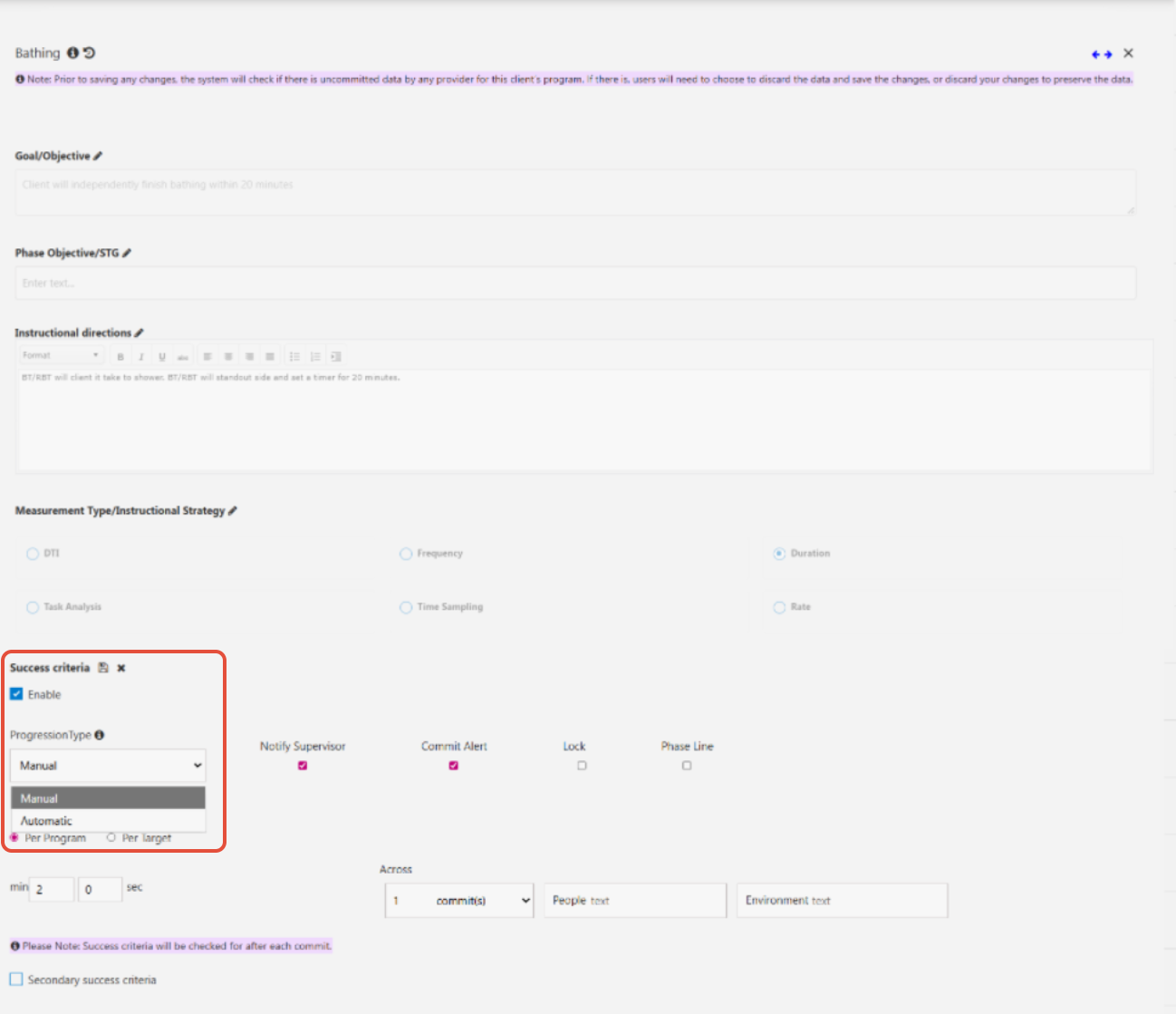 When you map a Duration based program to a Client Clinical Profile, or you are changing an existing program Measurement Type to Duration, the same configurable options will be available as in the Program Library. The success criteria will be specific to Duration (i.e., criteria in minutes and seconds). Another distinction that Duration based programs have is that there is no minimum or total trial count for the program as a whole or for allocation of trials across targets. If you would like the target to be available for data collection, you will need to simply set the status to any of the following active statuses (i.e., available for data collection): Baseline, In Progress, Maintenance, Generalization, and Post-Probe.