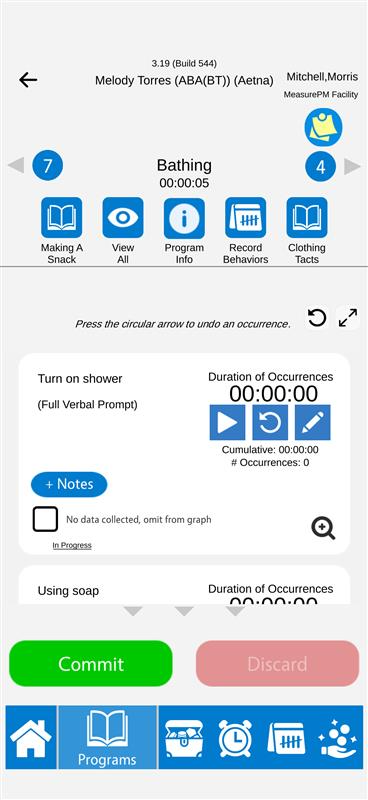 Since there is no minimum trial requirement for Duration, users can select the Commit button without recording any duration to commit a 0 duration and 0 occurrence for that program. Otherwise, you can record data using the play button beside the target(s). When the play button is selected it is replaced with a stop symbol and the timer begins to count upward. When the stop button is selected, the duration and occurrence is recorded. The cumulative duration and occurrence count for the target is shown below the play symbol. In the event that the play button was accidentally selected, the timer can be reset to 0 without the time being recorded by using the refresh icon. Finally, users can use the pencil icon to manually add duration and occurrences without using the timer seen below. When finished recording, select Commit as you do with any other program. When the program has multiple targets, they will appear as they do below. You are still able to commit at 0, without recording any duration if you would like, or you can collect data for one or all targets in the same manner as outlined above.