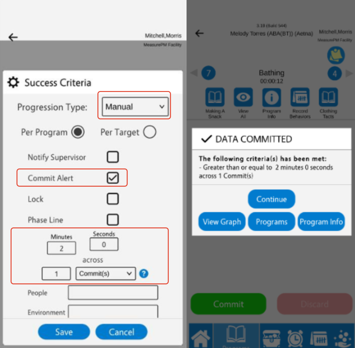 When configuring success criteria for a Duration program you will be entering what total duration of minutes/seconds are needs to achieve mastery criteria (applicable for manual and automatic progression), and/or entering total duration of minutes/seconds to trigger revisions criteria (applicable for auto progression only).
