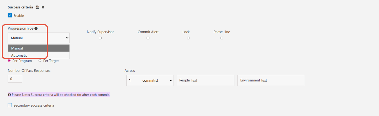 You can configure manual success criteria on both the Web and Mobile-App, and you can configure automatic criteria across Web only.