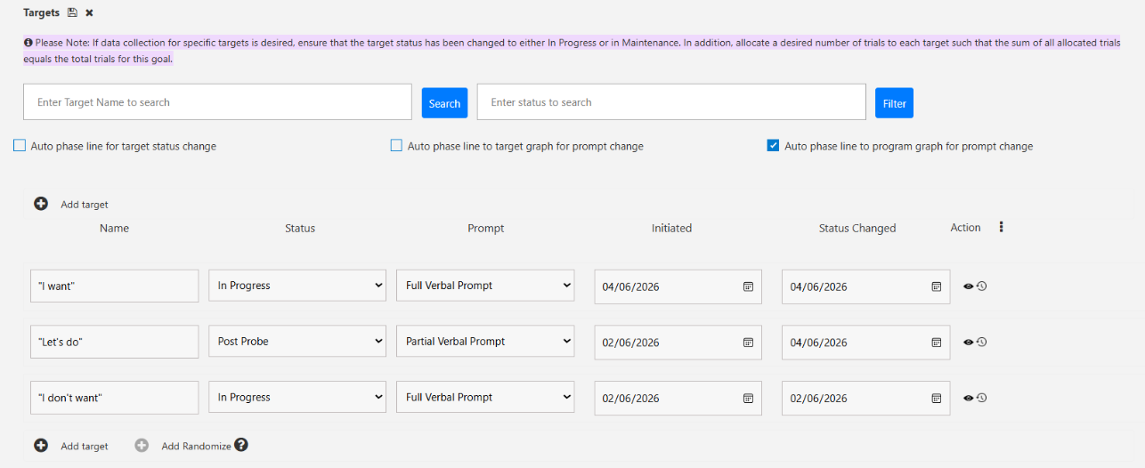 When you map (i.e. add) a Frequency based program to a Client Clinical Profile, or you are changing an existing program Measurement Type to be Frequency, the same configurable options will be available as in the Program Library. You can ensure Frequency is selected as the Measurement Type and you can see the success criteria is based on Frequency. Another distinction Frequency based programs have is that there is no minimum or total trial count for the program as a whole or for allocation of trials across targets. If you would like the target to be available for data collection, you will need to simply set the status to In Progress or Maintenance.