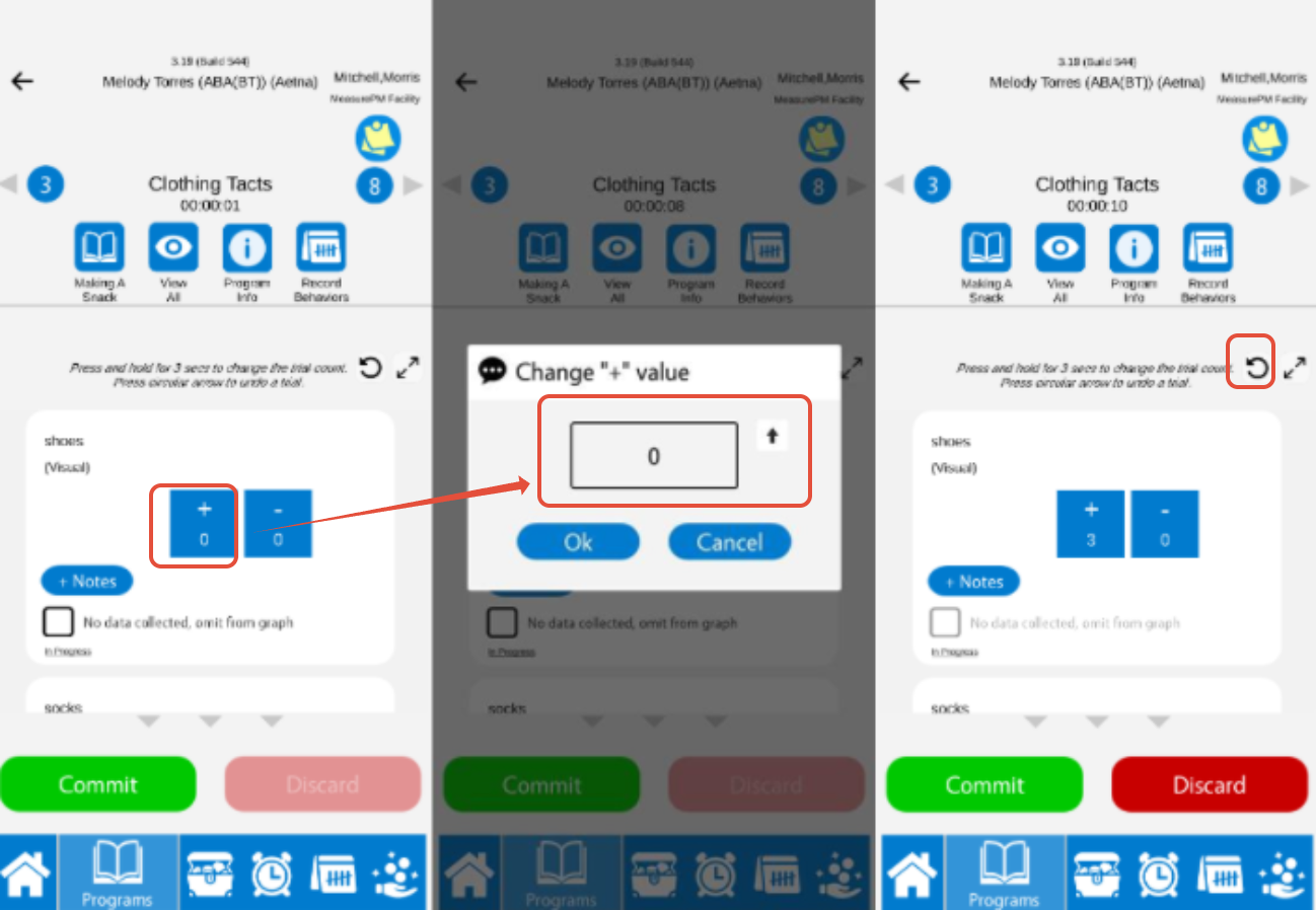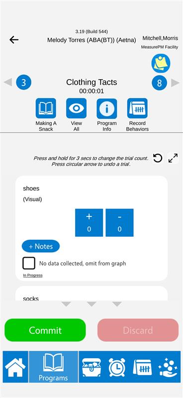 To record multiple trials of the same data recording type at one time, hold down on the data recording type and enter the number or trials you would like to add or use the up/down toggle arrows on the pop up. To remove a trial or bulk of trials, use the undo button in the top right-hand corner of the recording window and trials will be removed in reverse order of which they were recorded. When finished recording, select Commit as you do with any other program.