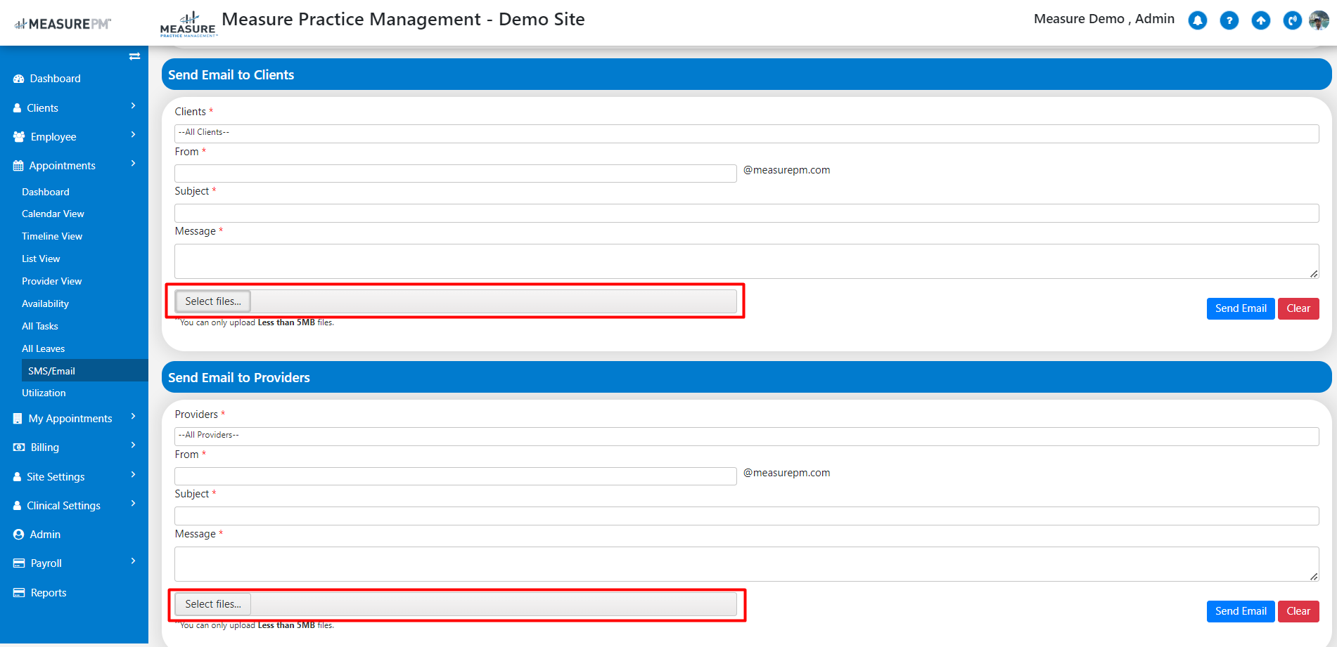 For the SMS/Email page under the Appointment category, prior to this change we could only send the email with text. With this new enhancement, now we can send attached files along with the email.