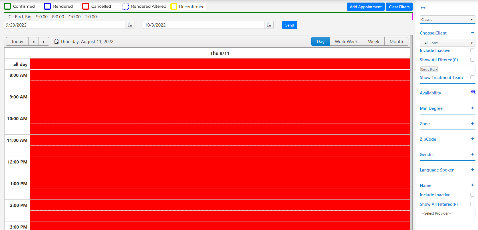 When the scheduler goes to view the clients availability they will see that the clients calendar view is in Red.