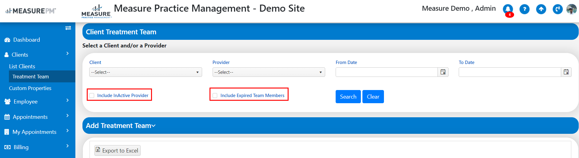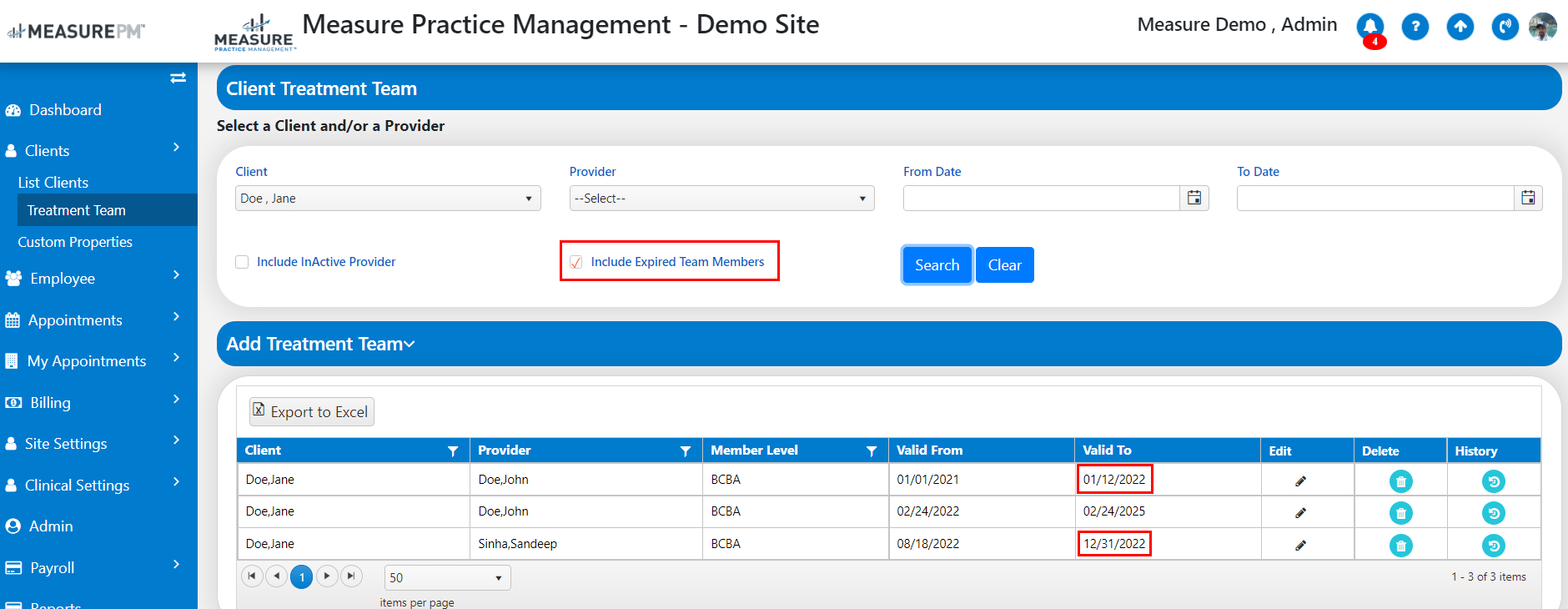 Enabling "Include Expired Team Members" will show all the active as well as inactive treatment teams.