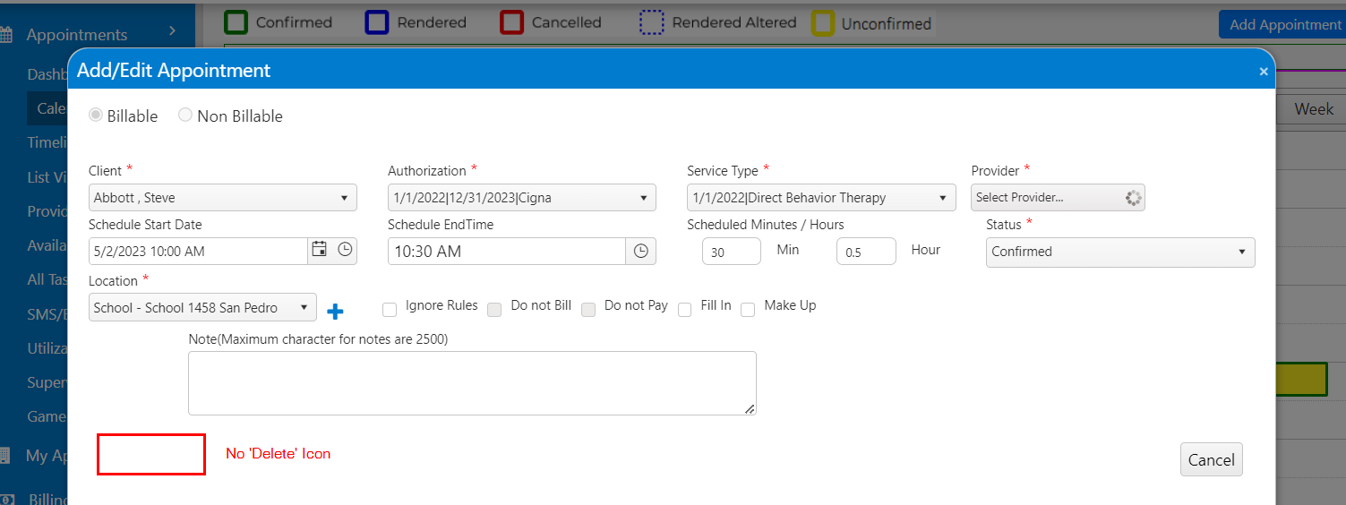 2. When you disable the permission "Allow To Delete Billable Appointment In Calendar And Timeline View" for a group they would not be able to delete the billable appts from the Calendar And Timeline View pages.