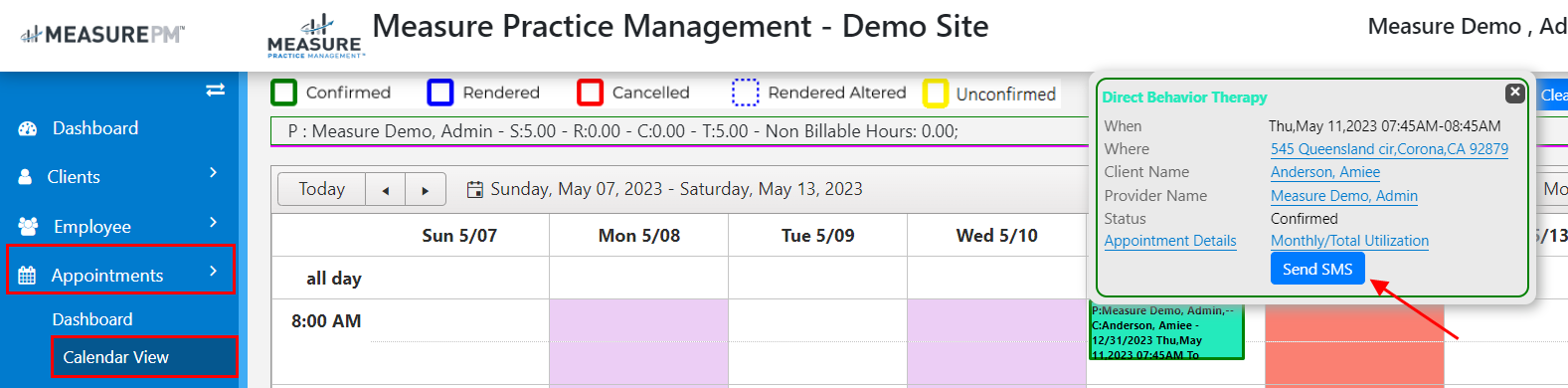 the users would be able to view the "Send SMS" icon in the appt popup.