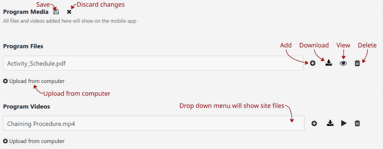 The Program Media allows you to configure PDF files and MP4 videos on a per program basis. The media uploaded here is accessible to view from the Mobile-App.