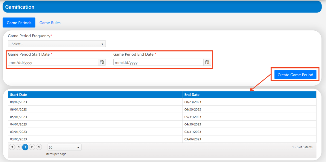 To save the game period select “Create Game Period”. Once saved, the game period will be displayed in the table on the screen.