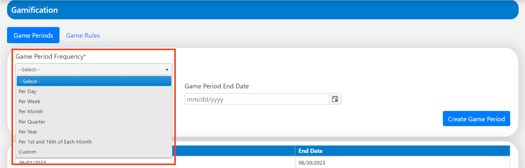 In the first tab, start by selecting a game period frequency from the related dropdown menu. Options include: (i) day, (ii) week, (iii) month, (iv) quarter, (v) year, (vi) 1st and 16th of each month, and (vii) custom time frame.
