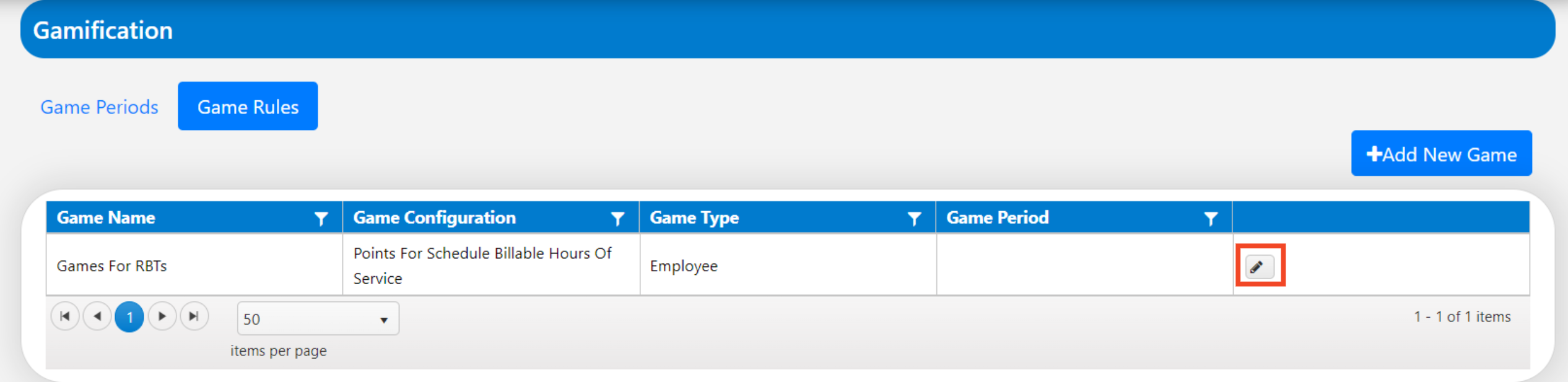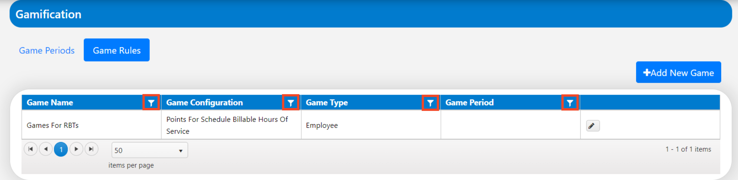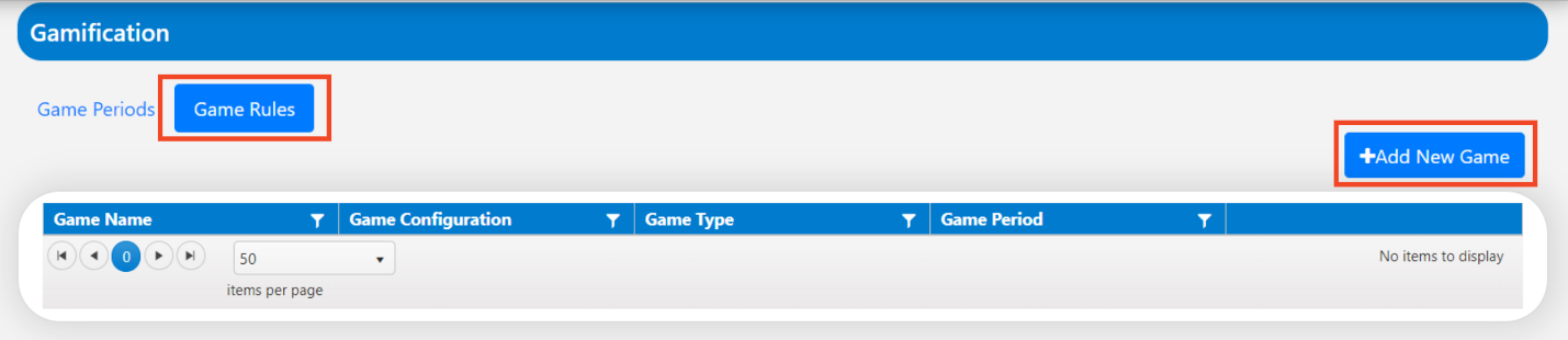 Once the desired game period has been created, select the Game Rules tab, which will display all created games organized by Game Name, Game Type, Game Configuration and Game Period. To create a game, select the blue “+Add New Game” button located directly above the right side of the table.