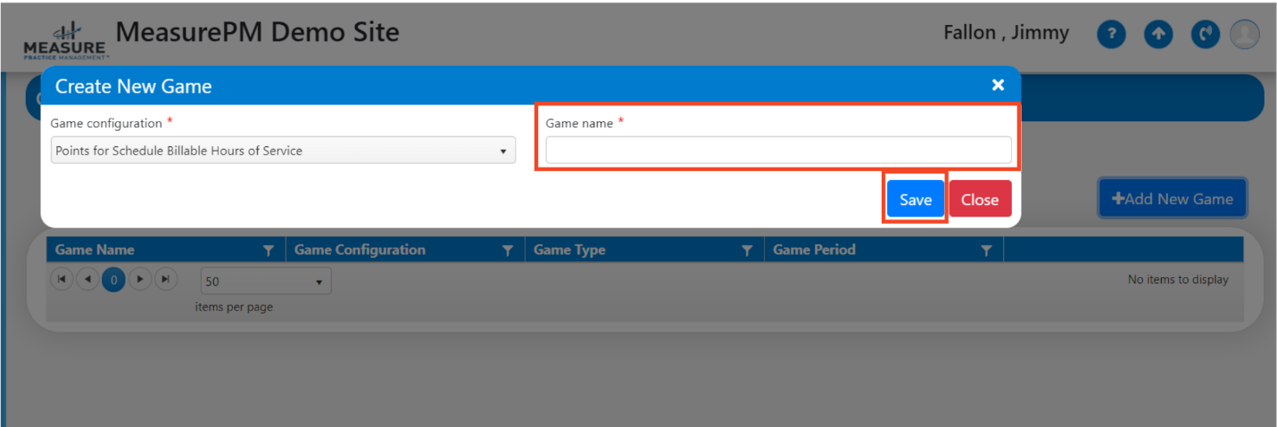 When adding a new game, a pop-up window will be displayed. Currently, all created games will be configured as Points for Schedule Billable Hours of Service. This is an employee-based game configuration with pre-set condition options. To proceed with creating a new game, start by typing in a unique game name and select Save.