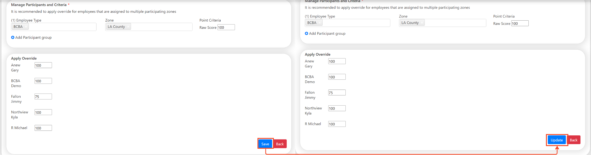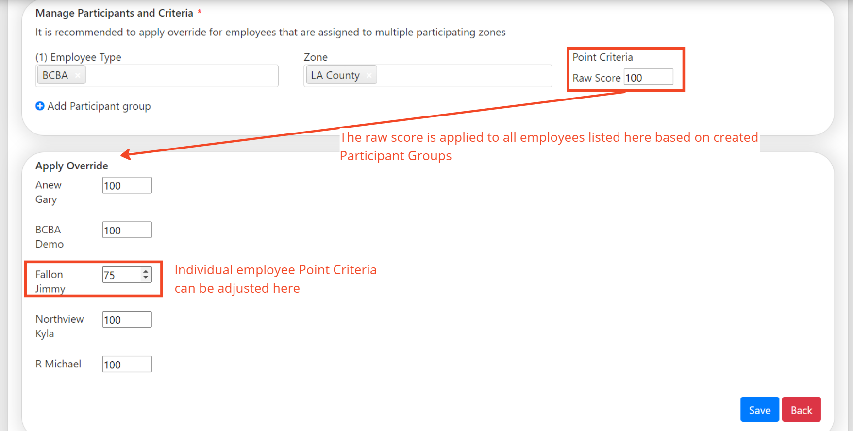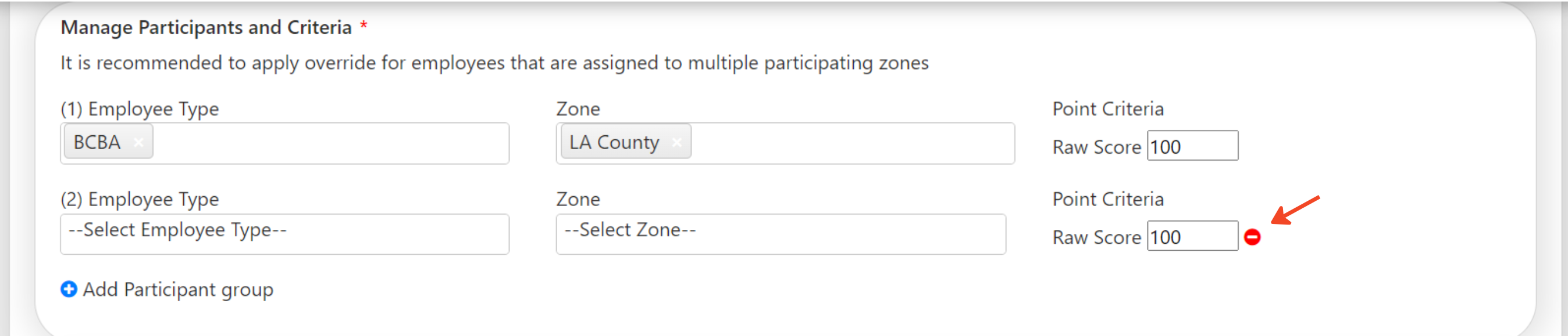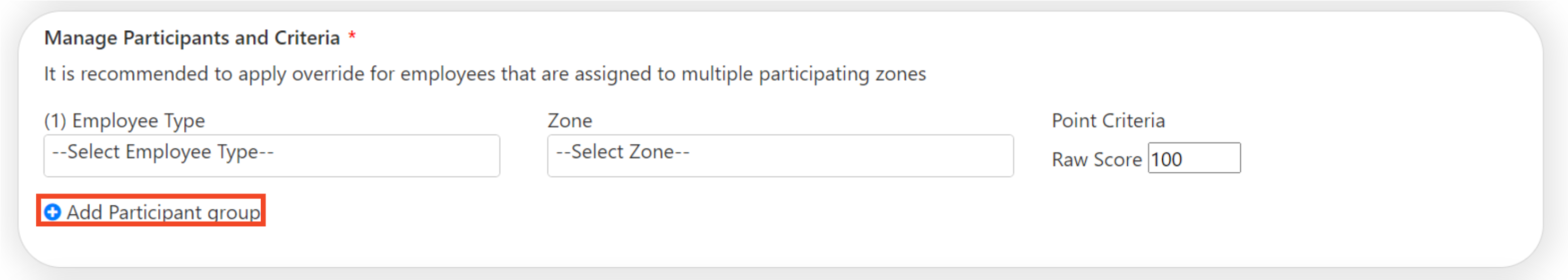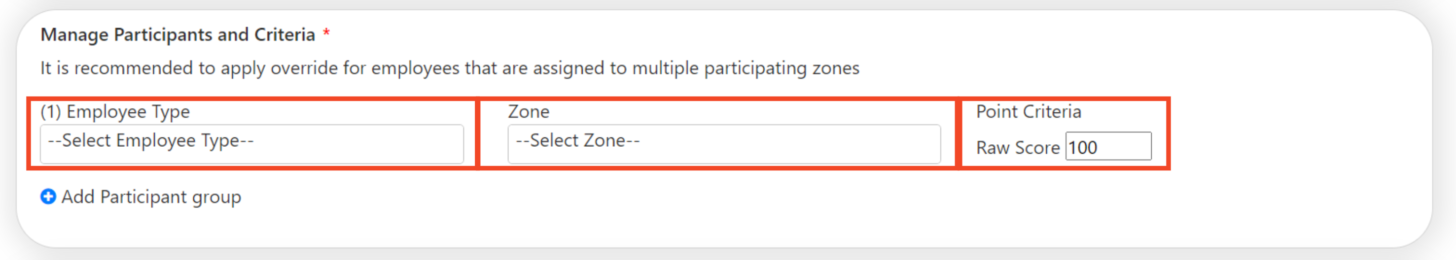 Within the Manage Participants and Criteria section game participants, based on Zone and Employee type, are established and point criteria is configured for each participant and group.
