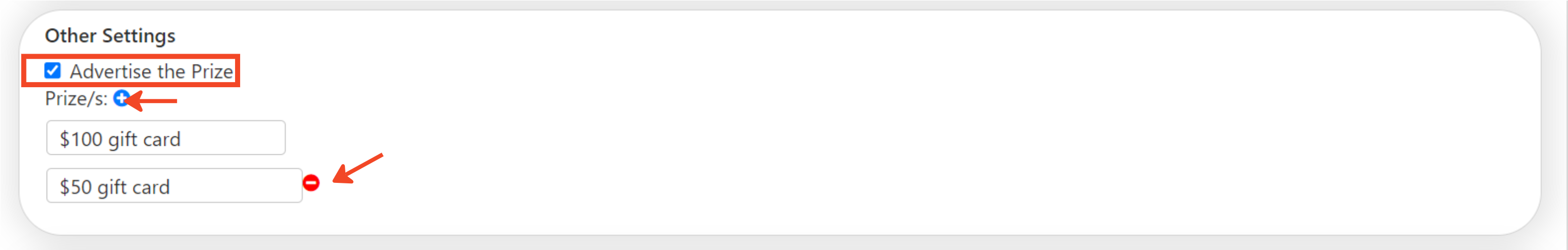 Prizes can be configured in the next section. To add prizes, first select the “Advertise the Prize” checkbox. To add more than one prize, select the blue “+” icon and to remove any prizes, select the red “-” icon. Prizes added here will be displayed on the Web in the Game Dashboard and under My Points and on the Mobile-App under My Points. The order in which the prizes are added dictate their ranking (e.g., 1st, 2nd, 3rd, etc.) You can add as many prizes as you would like here, however only first 3 will be advertised to employees.