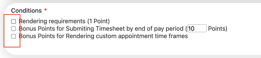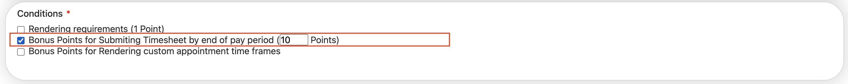 If this condition is selected, users will get the designated point value if/when they submit their timesheets to payroll via My Timesheets on the mobile-app or website, by the end of the pay period.