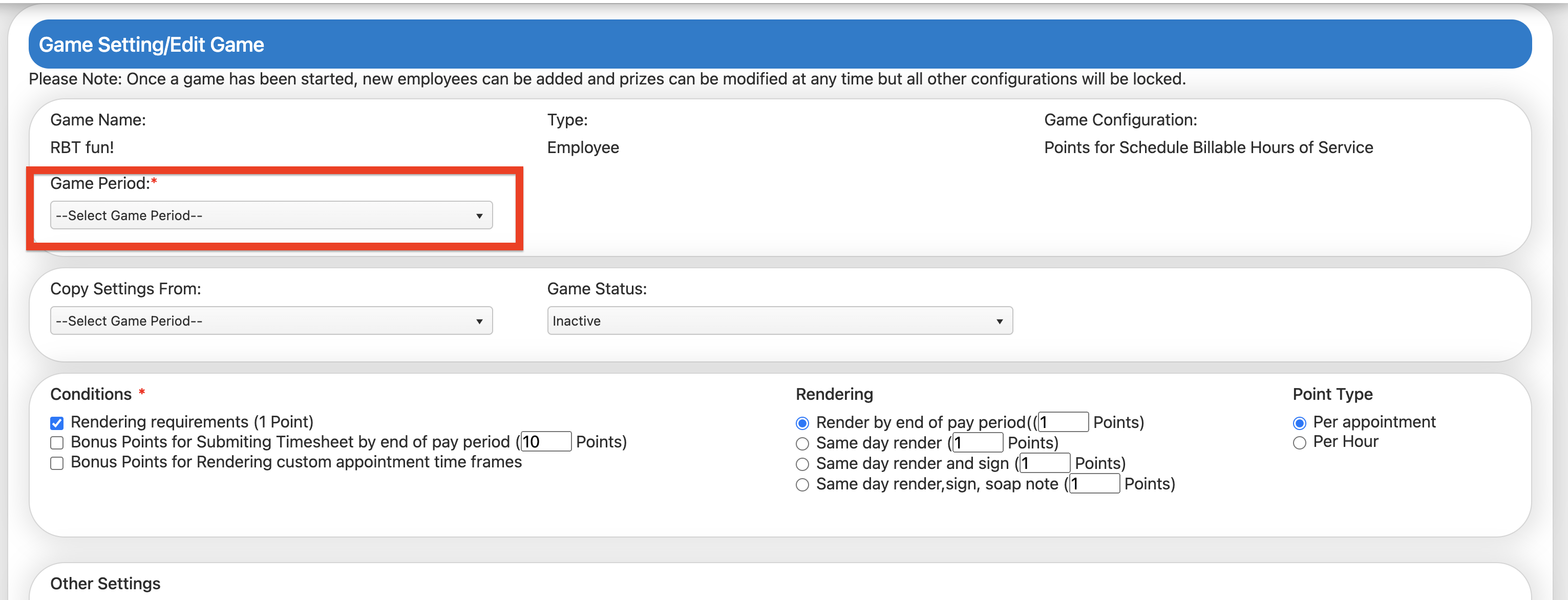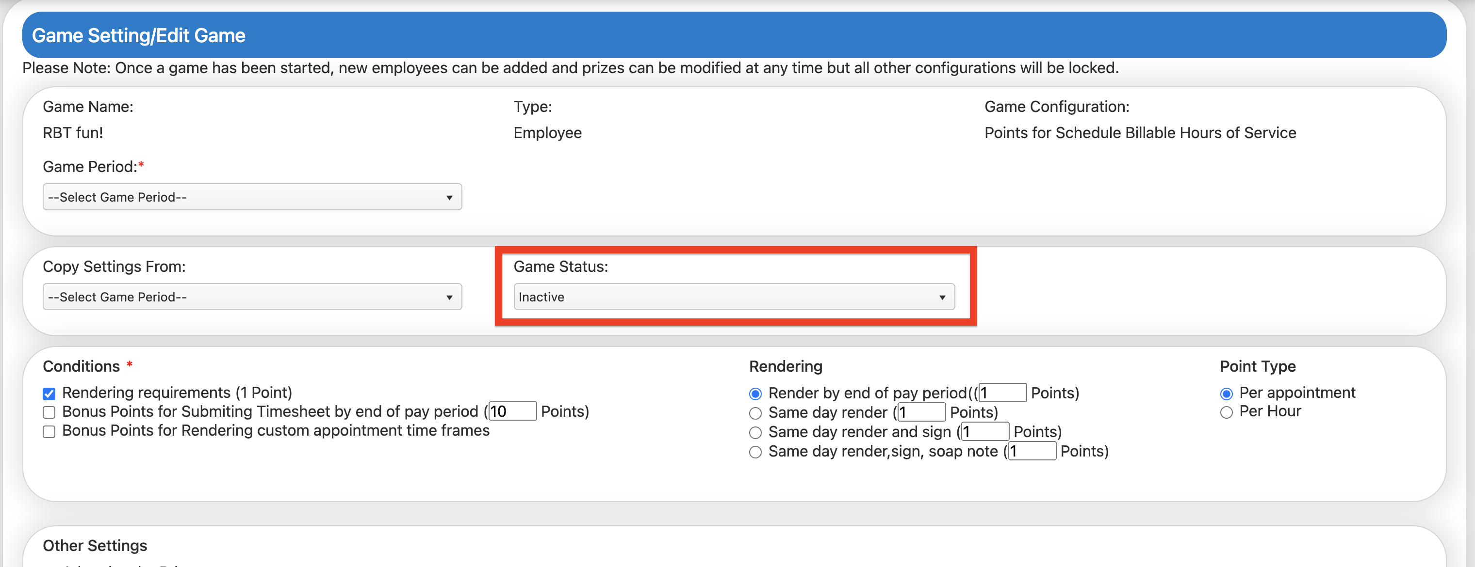 - To stop a game that has already been started, simply change the status from Active to Inactive in the game settings