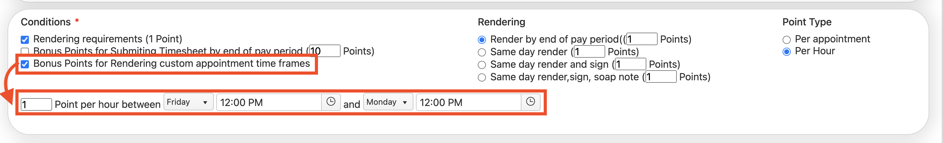 - Render by end of pay period: If a billable appointment is rendered by any user by the end of the pay period it falls in, the provider of that appointment gets points