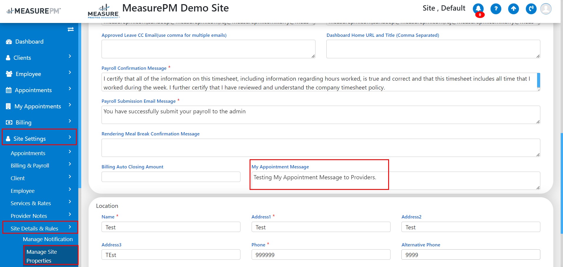 There is a new text box field added by the name "My Appointment Message" under the Manage Site Properties page of Site Settings that will show the text on the My Appointment page when added over here.