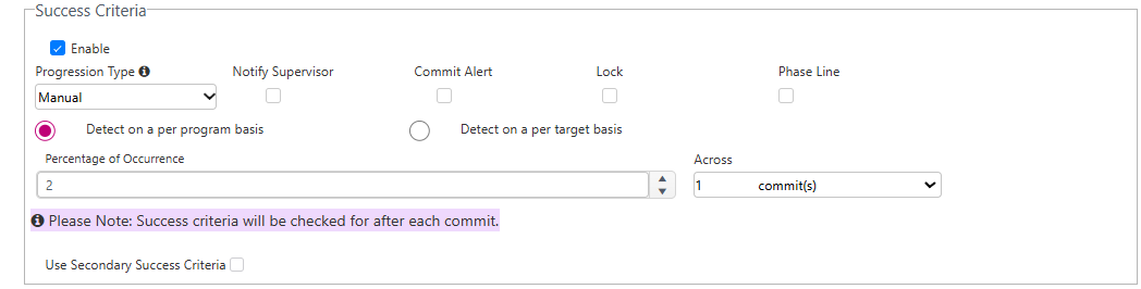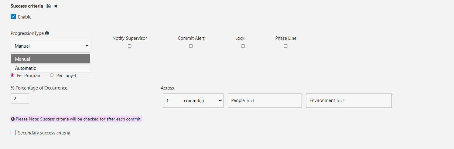 The success criteria for Time Sampling programs is automatically set to Percentage of Occurrence with the option to have it configured manually or automatically.