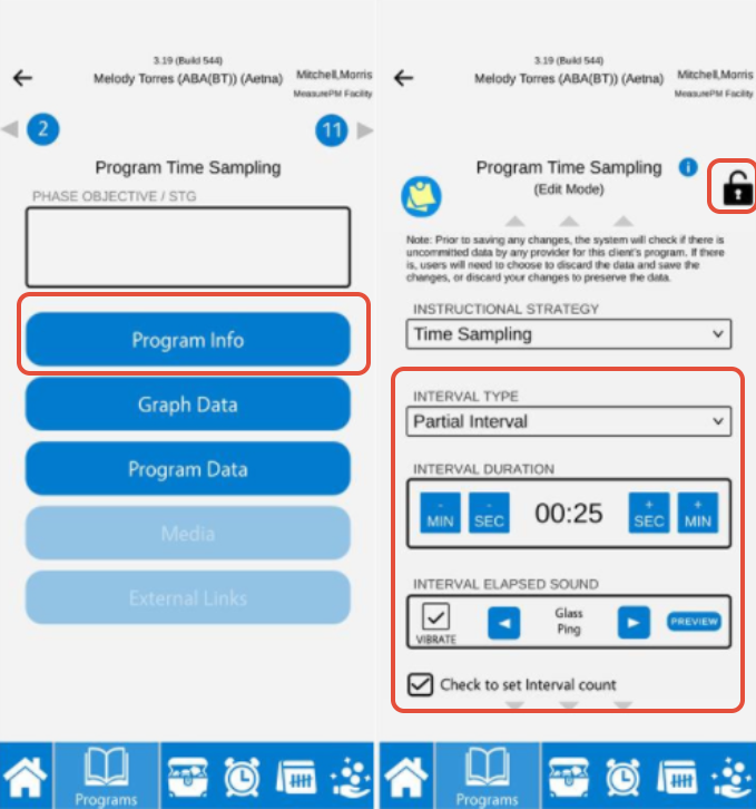 The configurations for newly mapped (a.k.a "added") Time Sampling programs or existing programs modified as Time Sampling will be identical to those available from the Program Library. If needed, the success criteria can be modified (e.g., enabled/disabled, modifying already configured criteria) at the client level. Like all other Measurement Types, only In Progress and Maintenance Targets will be available for data collection on the Mobile-App. For Time Sampling, however, only 1 target may be In Progress or in Maintenance at a time.
