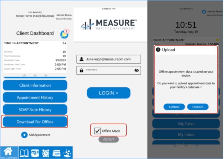 Collecting and committing Time Sampling data is also supported in Offline mode. To ensure you will be working with the most up to date configurations for the client while offline, make sure you select the “Download for Offline” button prior to using offline mode (for example, earlier in the day). To access Offline mode, select the “Offline Mode” checkbox when logging onto the Mobile-App. You can continue collecting data as you would in online mode, however, you will not get a notification after you select commit. When you log back in online mode, you will be asked if you would like to upload (i.e., “sync”) the appointment information to the database. Selecting Upload will then send all data collected in Offline mode to the server and be saved. If you do not upload, select discard, and the data will not be committed.