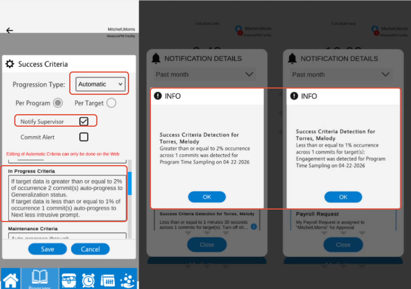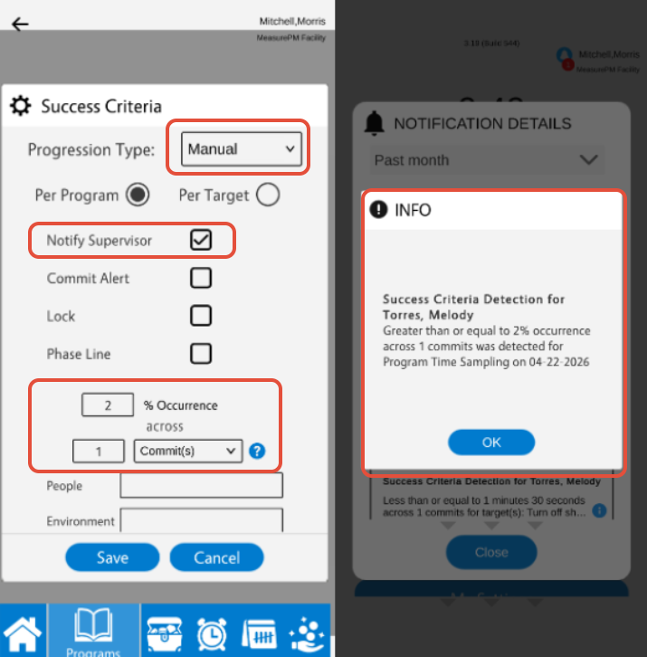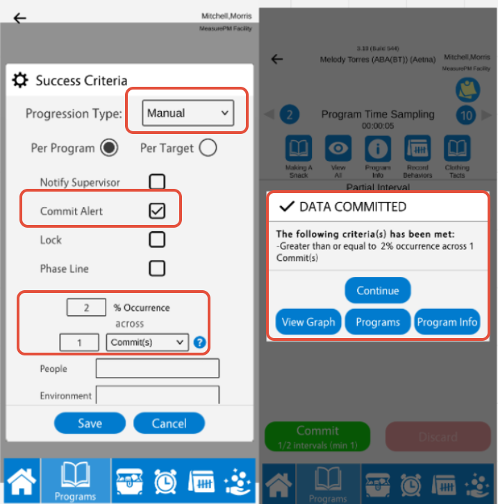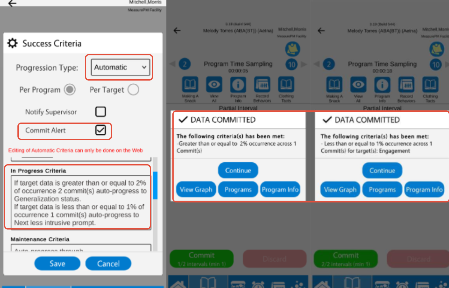You can configure manual success criteria on both the Web and Mobile-App, and you can configure automatic criteria across Web only. When configuring success criteria for a Time Sampling program, you will be entering what maximum percentage of intervals during which the target behavior occurred (applicable for manual and automatic progression), and/or entering the minimum percentage of intervals during which the target behavior occurred to trigger revision criteria (applicable for auto progression only).