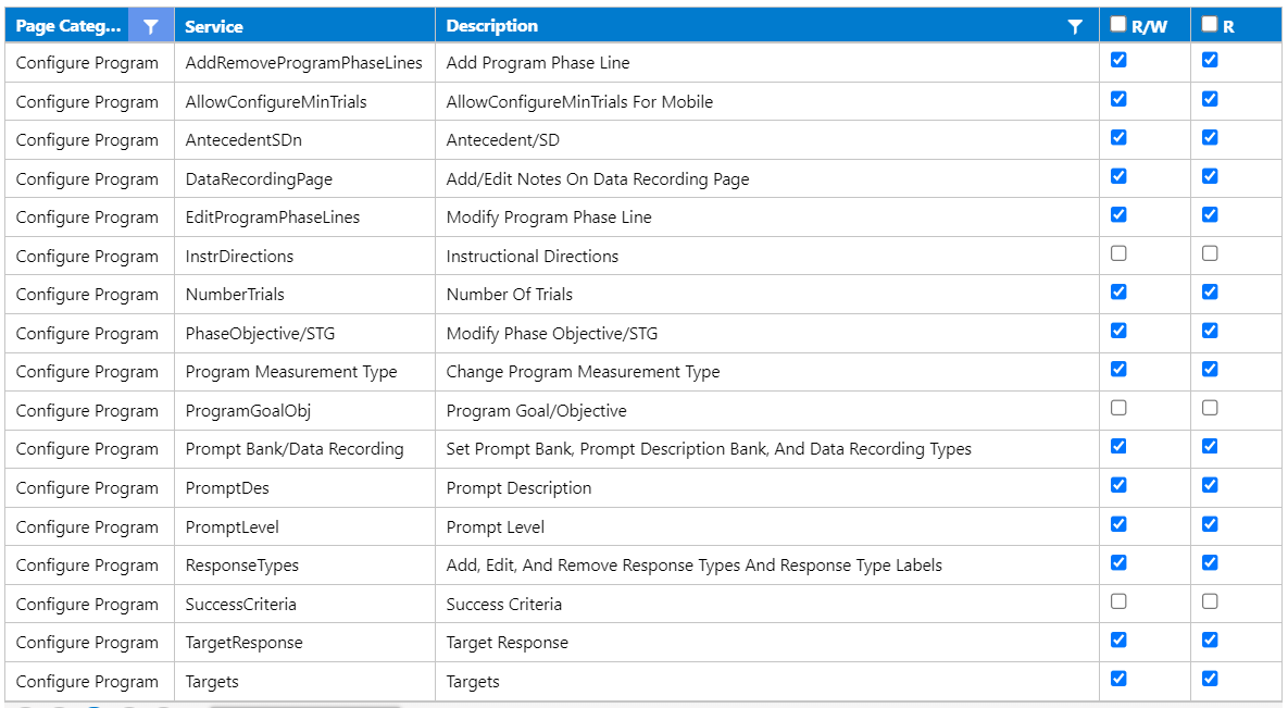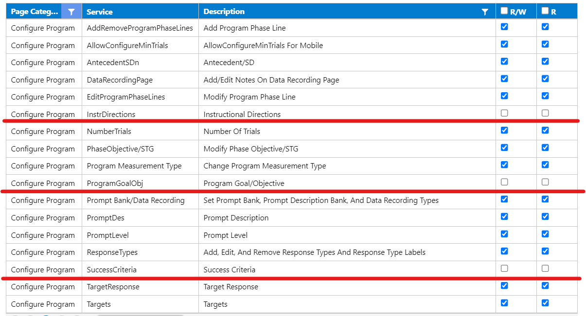 To date, the Instructional Directions, Program/Goal Objective, and Success Criteria permissions have been updated, and the following will be updated with our next release.