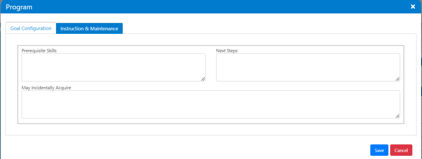 Incidentally May Acquire is only configurable at the Program Library level. You will be able to enter the skills a learner may acquire as a result of teaching the current program within the "Instructions & Maintenance" tab. Note that filling out this field is optional when creating and editing programs.