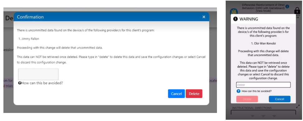 When making changes to program configurations, the system automatically checks to see if there is any uncommitted data for the program across any user device. If uncommitted data is detected, you will be notified of such via a pop up and can opt to discard the data if desired. Note that you will not be eligible to make the change unless the the data is discarded. The following enhancements have been made to the corresponding pop up: