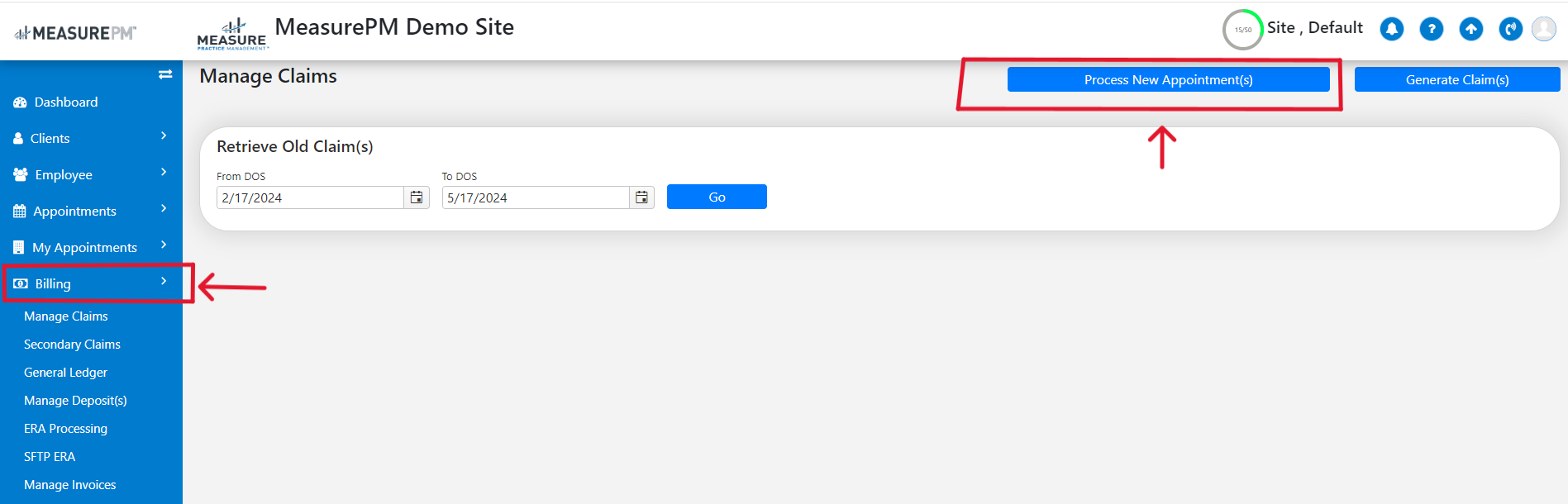 Step 1: Click 'Billing' on the menu tap. Then click on 'Process New Appointment(s)' (As shown in the image below)