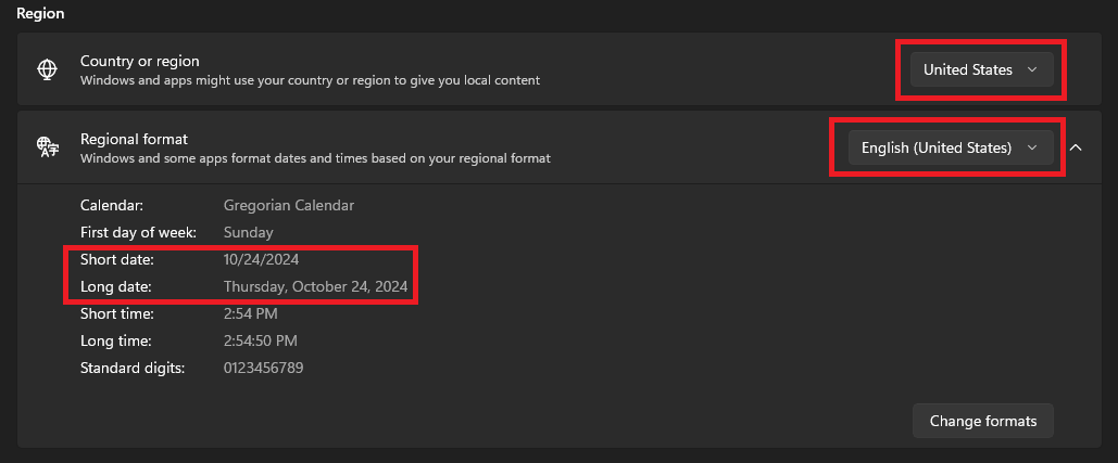 2.) Change the "Country or region" and "Regional Format" settings to match the following. Ensure the date formats match what is highlighted below.