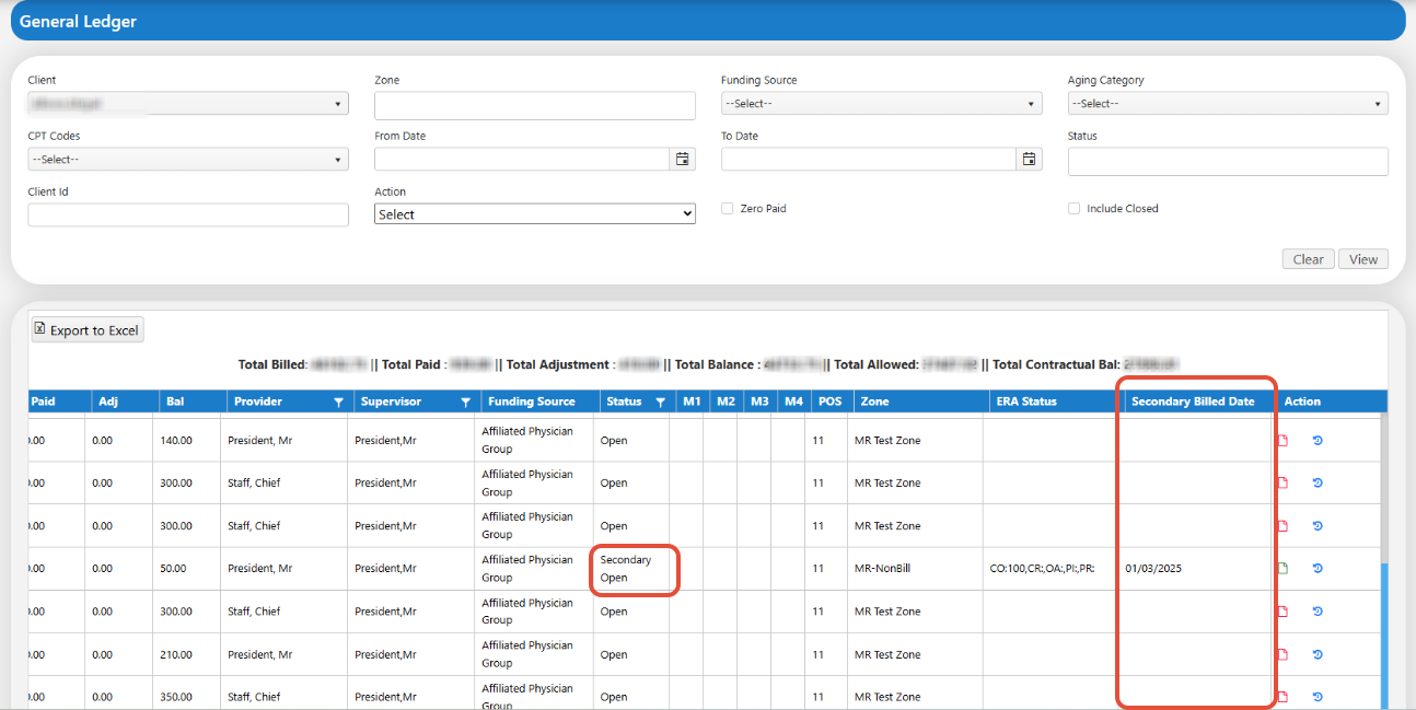 Ledger Enhancement: A new column, “Secondary Billed Date,” has been added to the ledger. This column displays the date when the secondary claim was billed, providing users with a clear timeline.