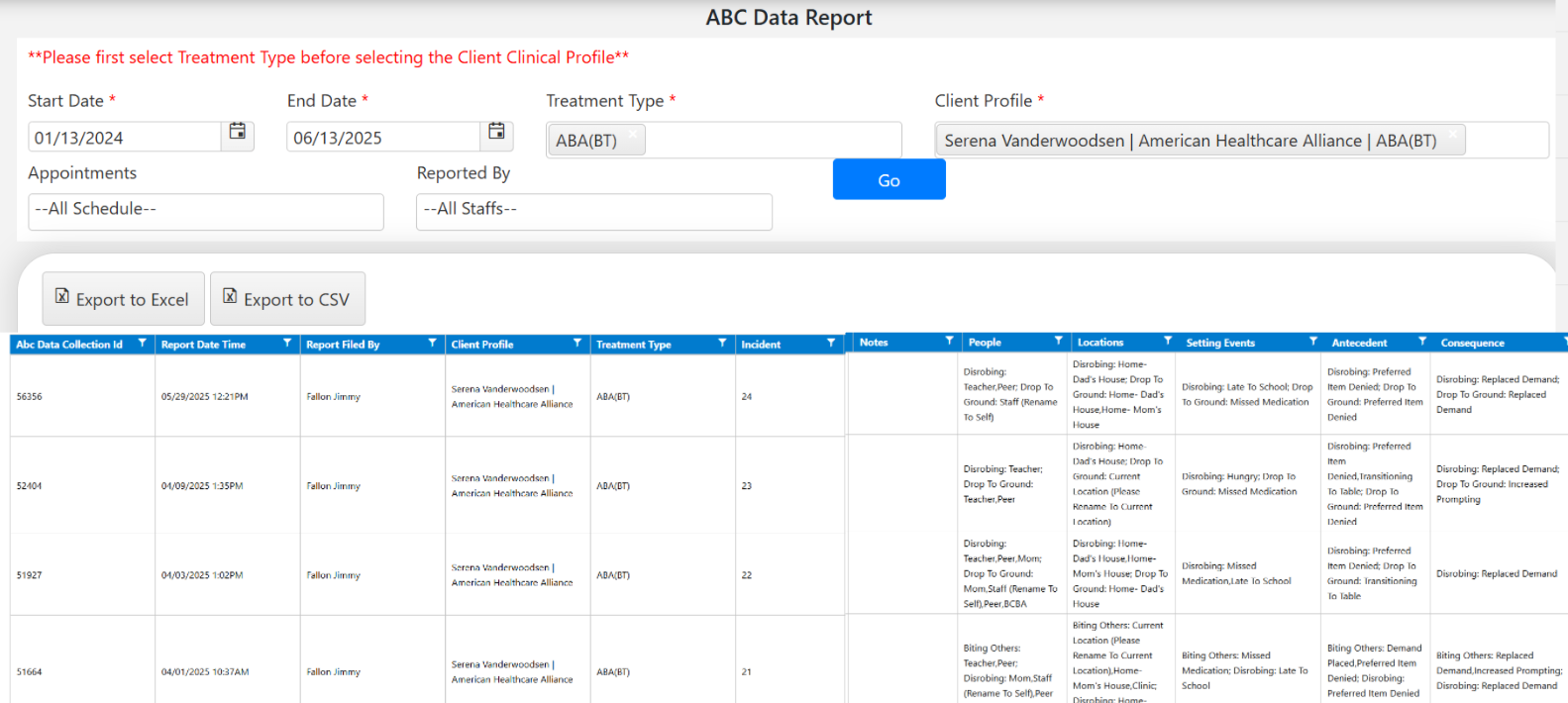 This report shows all committed ABC data for a selected client profile. Each row represents an individually committed record.