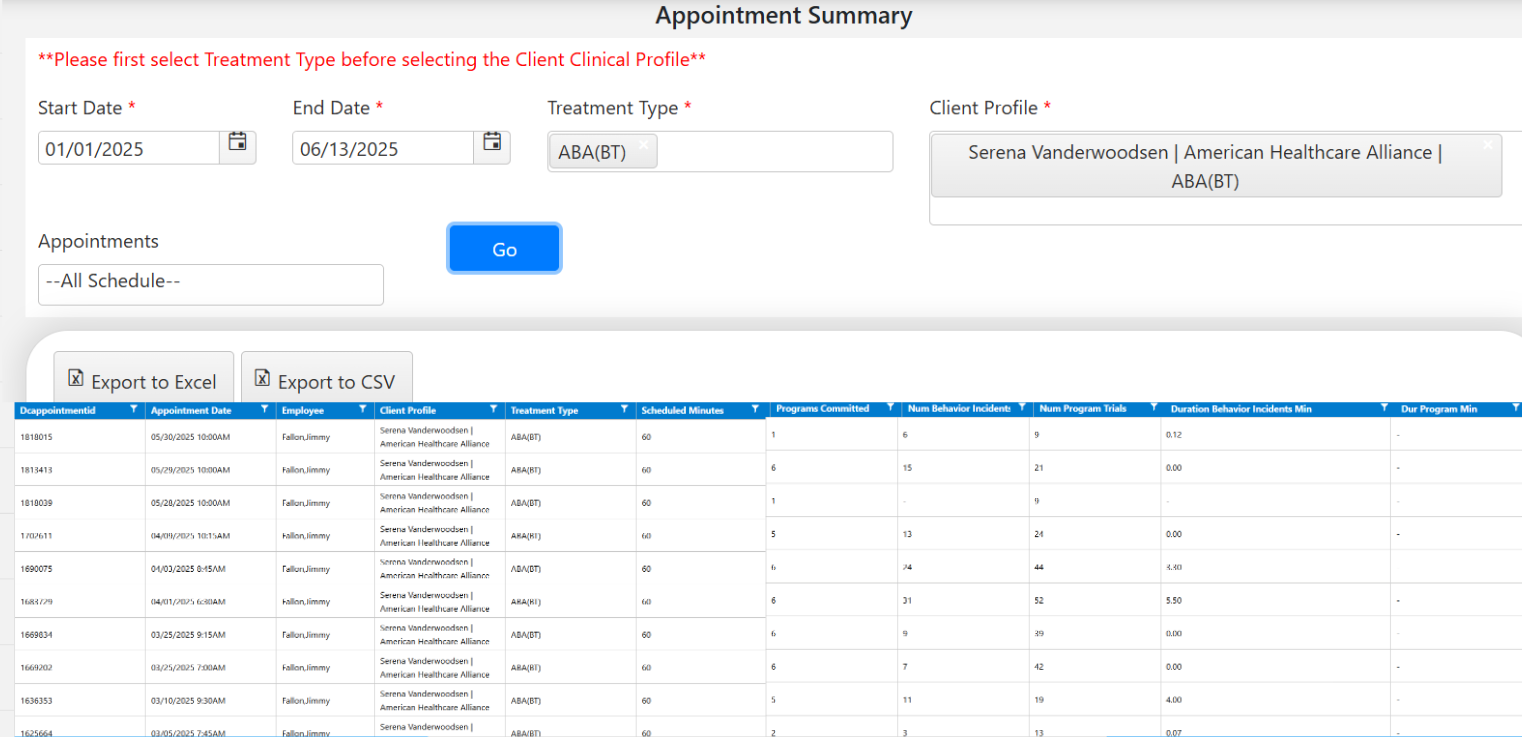 This report provides an overview of the number of trials, programs, and behavior incidents that were committed across rendered appointments. Each row in the report represents a separate appointment, and within each you can see the appointment details (i.e., date/time, provider, duration) along with the clinical data.