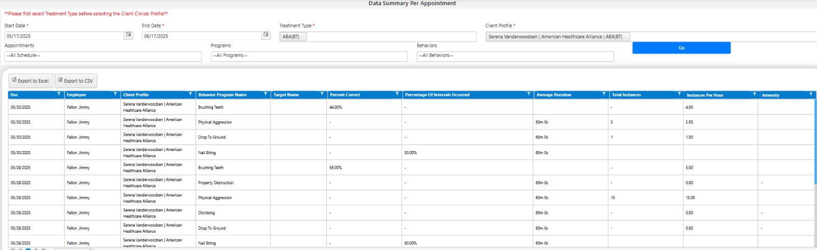 This report provides a summary of behavior incidents committed per client appointment. It’s used to review behavior trends with measurement types including frequency, duration, rate, intensity, and time sampling. Each row represents one appointment, and the behaviors committed during that session. The Rate Per Hour column is calculated by dividing the total frequency of the behavior by the rendered appointment duration in hours.