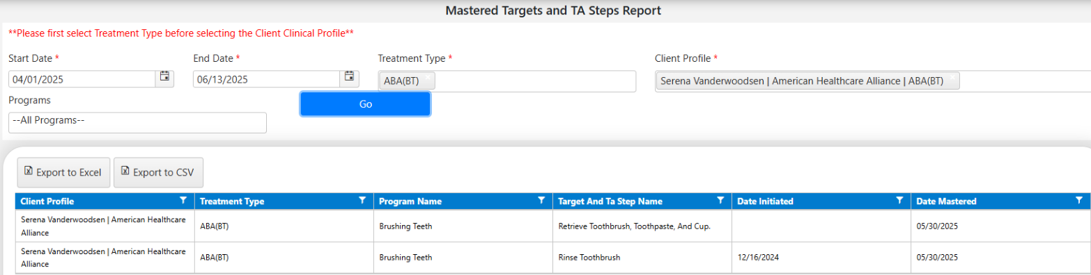This report displays a list of all program targets and task analysis (TA) steps that have been marked as mastered for the selected client within the chosen date range. It is used for providers to evaluate the pace of mastery across different programs. Each row reflects the individual skill or step that reached mastery criteria, along with the corresponding program name, initiation date, and mastery date.