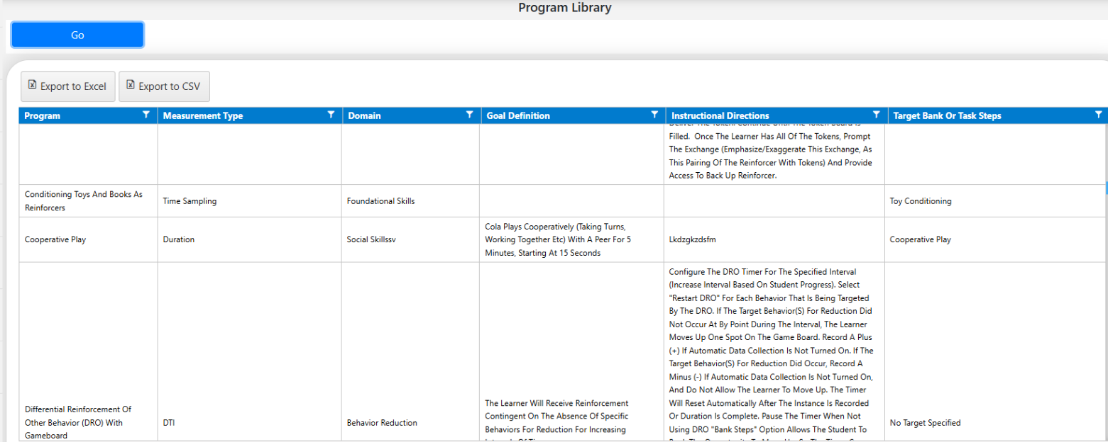 This report gives a reference list of all programs available within a company’s site library. It displays an outline of each program, including the measurement type, domain, goal definition, instructional directions, and target bank or task step list.