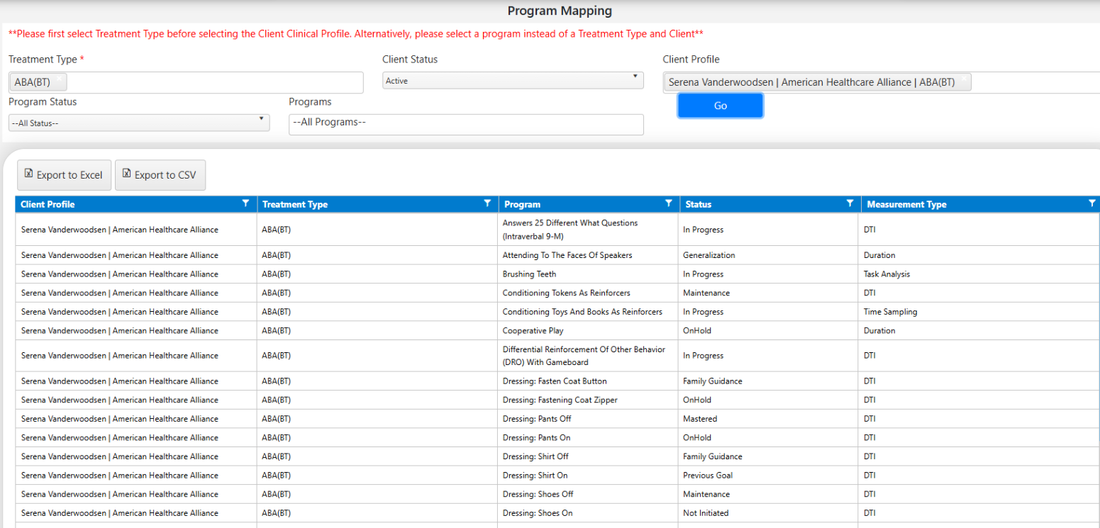 This report gives an overview of all programs mapped to a specific client profile. It can be useful for reviewing how often certain programs are used with each client. The report also shows details like the measurement type and current status of each program in the client’s profile.