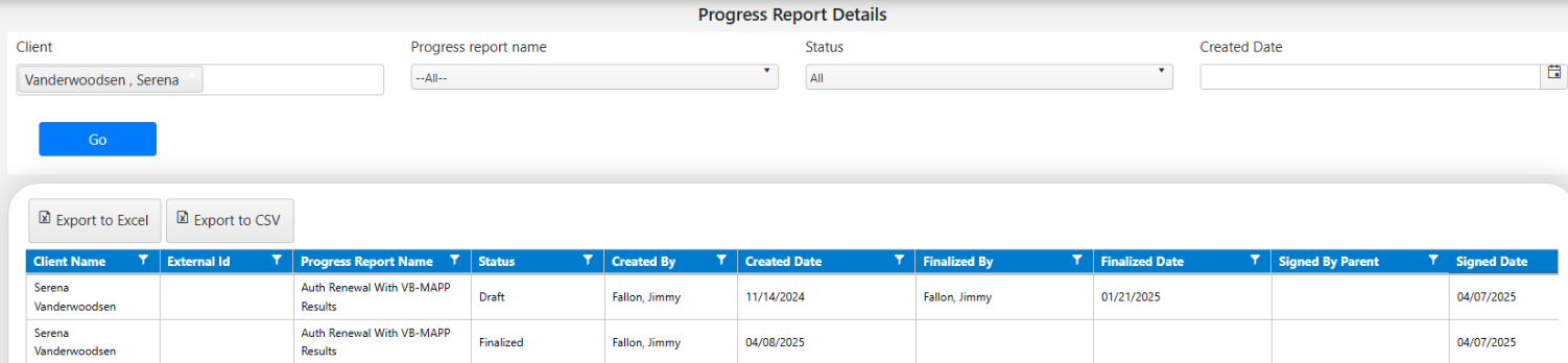 This report displays the status and history of client progress reports within a selected date range. It includes information on the report name, status (draft or finalized), the staff member who created and finalized the report, and whether the report has been signed by a caregiver. This report is used to track documentation completion and ensure timely submission and approval of required reports.