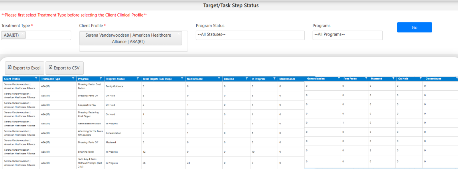 This report provides a comprehensive view of the number of targets or task steps that fall within each status across all programs for a selected client. The report displays the program name, status, and total number of targets/steps per program. Then, taking it one step further, breaks down the number of targets/steps by phase, including Not Initiated, Baseline, In Progress, Maintenance, Generalization, Post Probe, Mastered, On Hold, and Discontinued. This report is used to evaluate client progress, identify where intervention is currently focused, and monitor skill acquisition and progression over time.