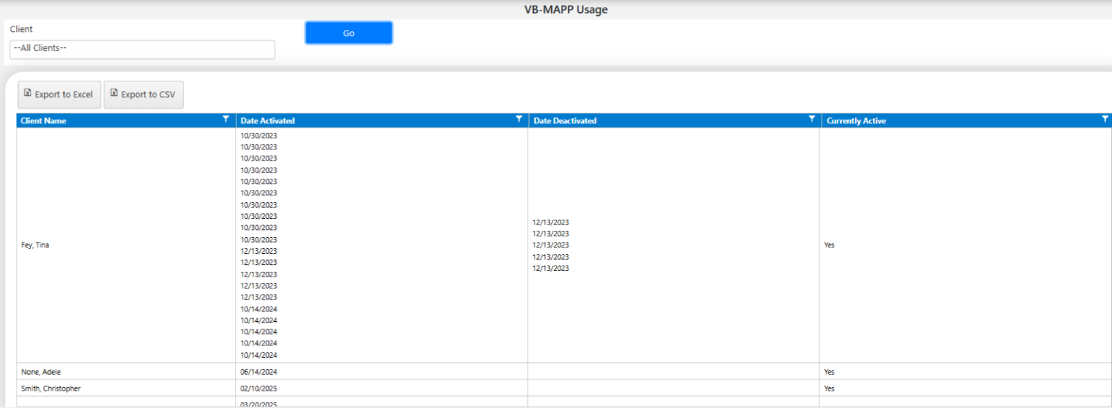 This report gives an overview of VB-MAPP assessment usage across clients. It’s used to view activation and deactivation dates of all VB-MAPP client flags and provide an indication of which clients currently have access to the assessment.