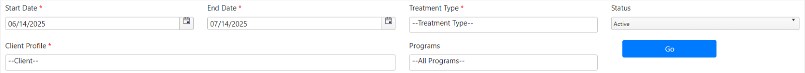 The clinical data reports consist of top-level filters, with the ability to filter further within the results grid. Once populated, they will all be exportable as both CSV and Excel files. Shown below is an example of the top-level filters. Any filter with a red asterisk is a mandatory field to fill out before being eligible to populate the report. Once required filters are fulfilled, select the Go button to populate the report.