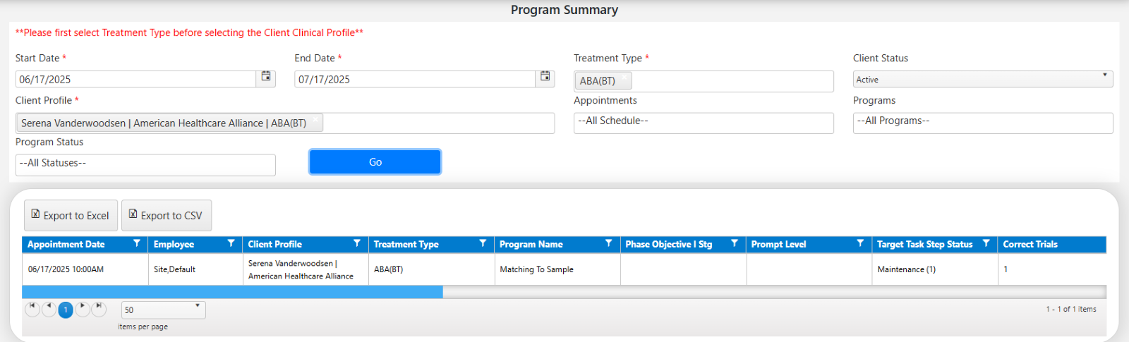 This report gives a summary of all program data committed across each scheduled appointment filtered within the date range, for a specified client. It displays each committed program and summarizes the trial counts and data for each.